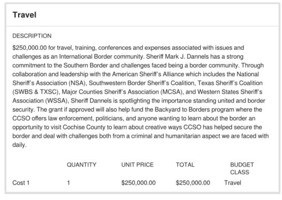 “$250,000.00 for travel, training, conferences and expenses associated with issues and challenges as an International Border [sic] community. Sheriff Mark J. Dannels has a strong commitment to the Southern Border [sic] and challenges faced being a border community. Through collaboration and leadership with the American Sheriff’s Alliance [sic] which includes the National Sheriff’s Association (NSA), Southwestern Border Sheriff’s Coalition, Texas Sheriff’s Coalition (SWBS & TXSC), Major Counties Sheriff’s Association [sic] (MCSA), and Western States Sheriff’s [sic] Association (WSSA), Sheriff Dannels is spotlighting the importance standing united [sic] and border security. [...]” [parentheticals all original.]