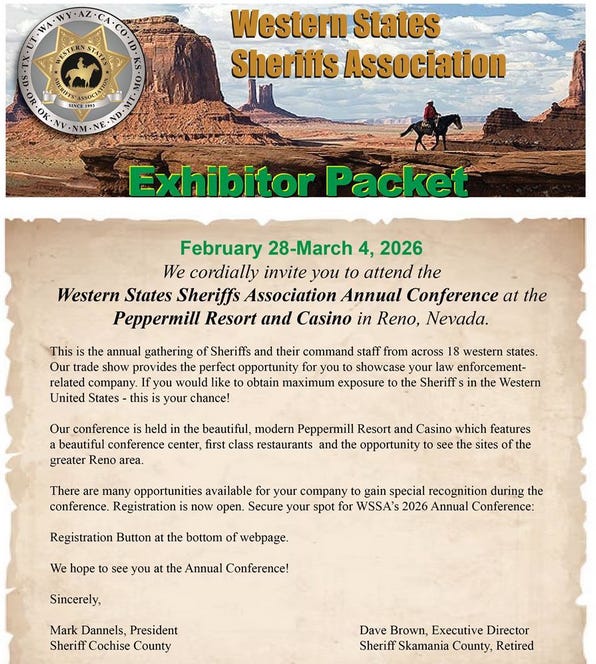 “This is the annual gathering of Sheriffs [sic] and their command staff from across 18 western states. Our trade show provides the perfect opportunity for you to showcase your law enforcement-related company,” reads WSSA conference promotional materials signed by Dannels. “If you would like to obtain maximum exposure to the Sheriffs [sic] in the Western United States - this is your chance! [sic]”
